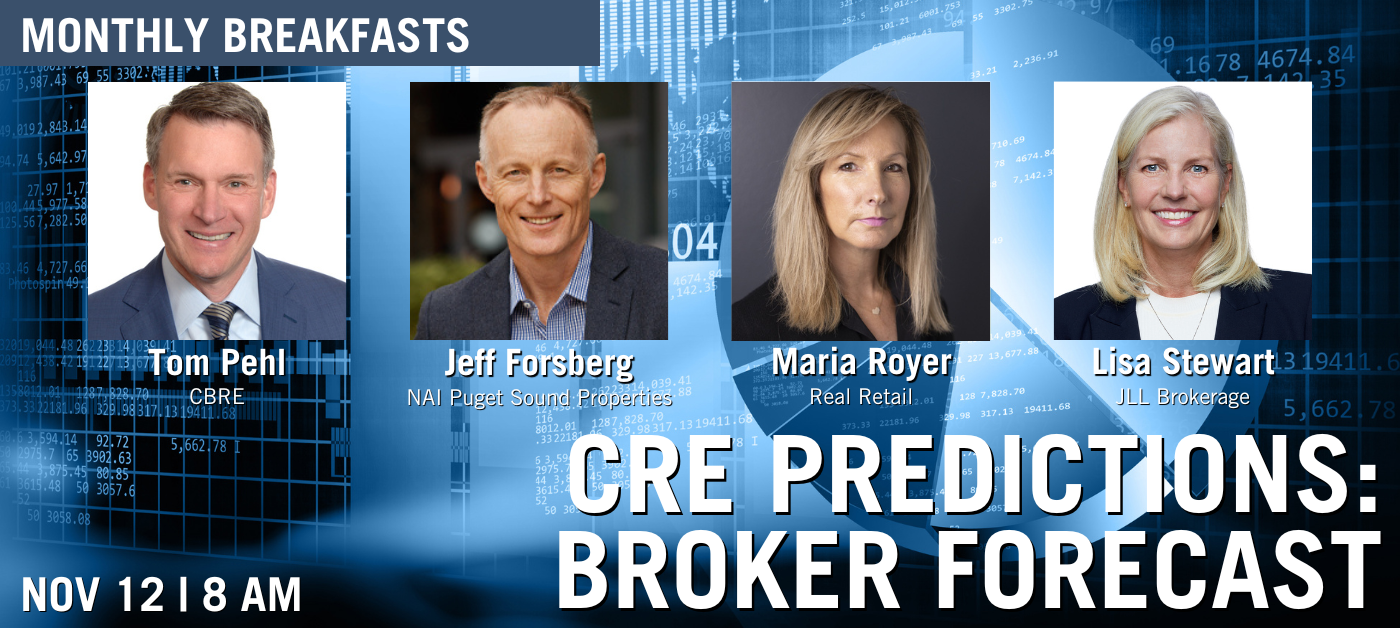How will borrowing costs, changing market dynamics, and global economic pressures continue to impact the CRE market into 2026 and beyond? NAIOPWA presents a panel discussion offering real-time insights into key indicators and market forecasts from top CRE brokers dealing with a range of asset classes in the Pacific Northwest. Join us on Wednesday, November 12 for our highly-anticipated annual Broker Forecast, where our expert panel will discuss what has happened over the past year and what changes they foresee in the next. This meeting also serves as NAIOP Washington State's annual business meeting, and principal members of the association are highly encouraged to attend to vote on the 2026 board of directors slate. NAIOPWA’s Breakfast Meetings convene industry thought leaders and subject matter experts for engaging, unbiased educational panels and networking. With more than 1,400 annual attendees, we offer timely industry information and networking opportunities featuring the region’s most influential developers, service providers and community leaders. Topics range from financing and leasing to technology, to government and regulatory policy. Speakers include: